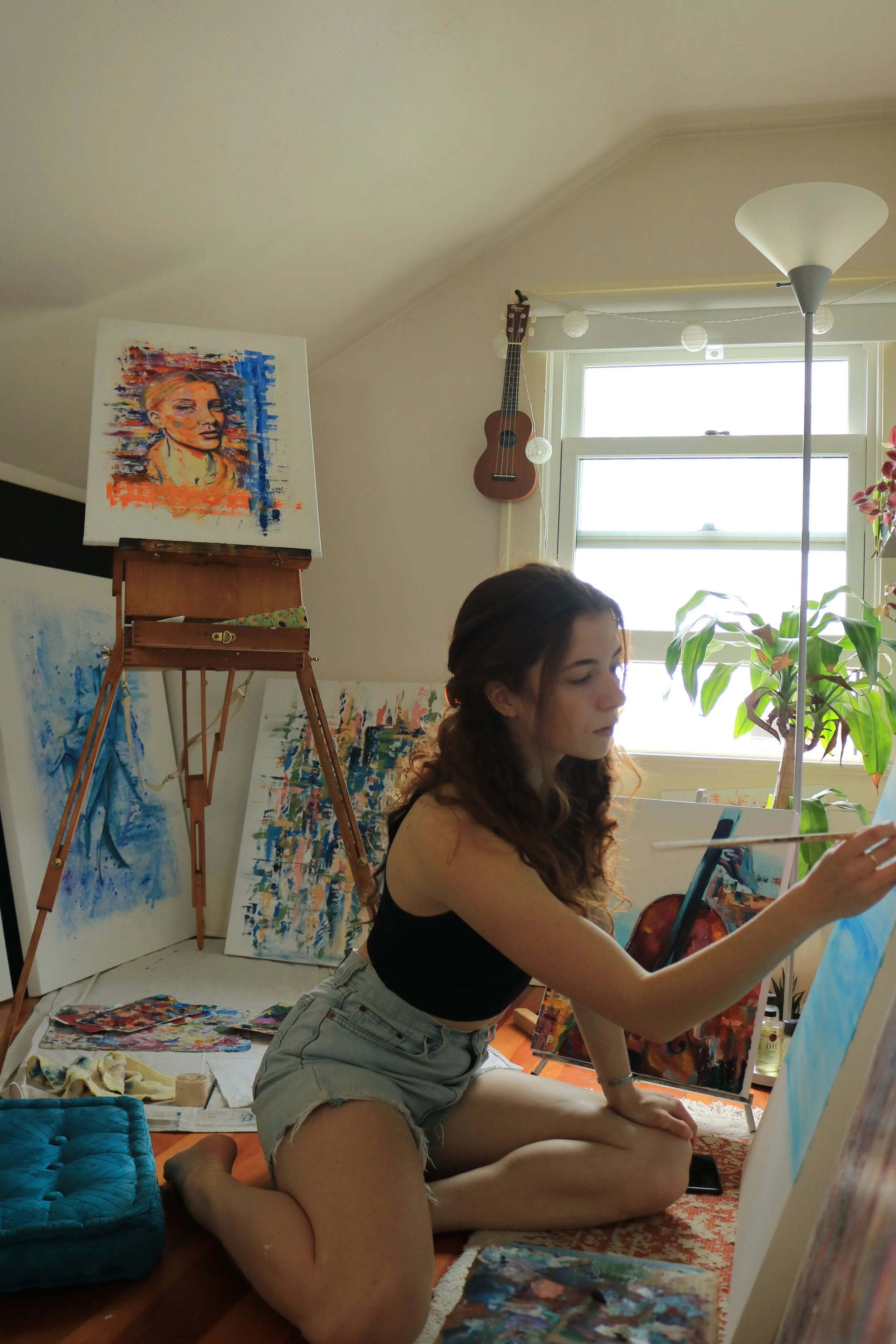 I’m currently having fun with acrylic paint, oil paint, and oil sticks(!!!). They give my heart and body that “holy %#!$ what is this?!?!?” feeling. I get excited about color. The blending and flow of it, how it interacts with itself in surprising ways… like finding that purple and green do not always make brown, even though the color wheel tells you it will. I do not always know what the art coming through me wants to be. That's the juicy stuff I do this for. It has come up as realistic portraits, nude women, bold colors, abstraction mixed with realism, human movement, and earthy motifs. I try to paint emotion… I’m not entirely sure what that means or how that shows up in my work, but I’m real curious about it.